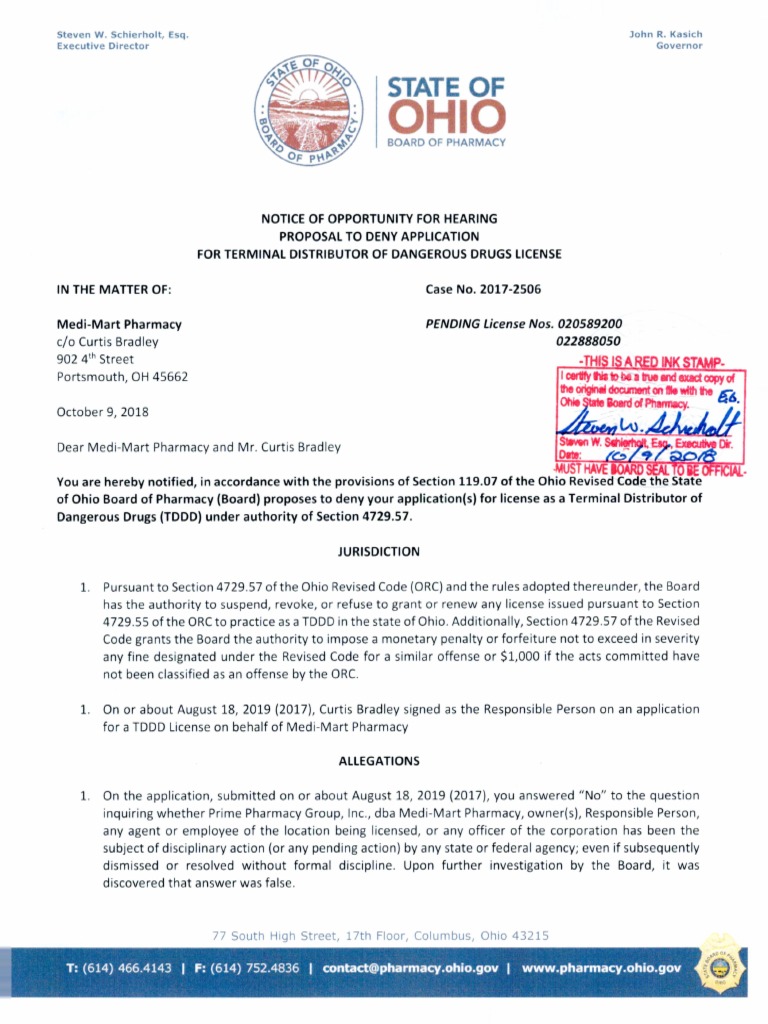 of Registration, Medi-Mart's State of Ohio pharmacy license was subsequently downgraded to a