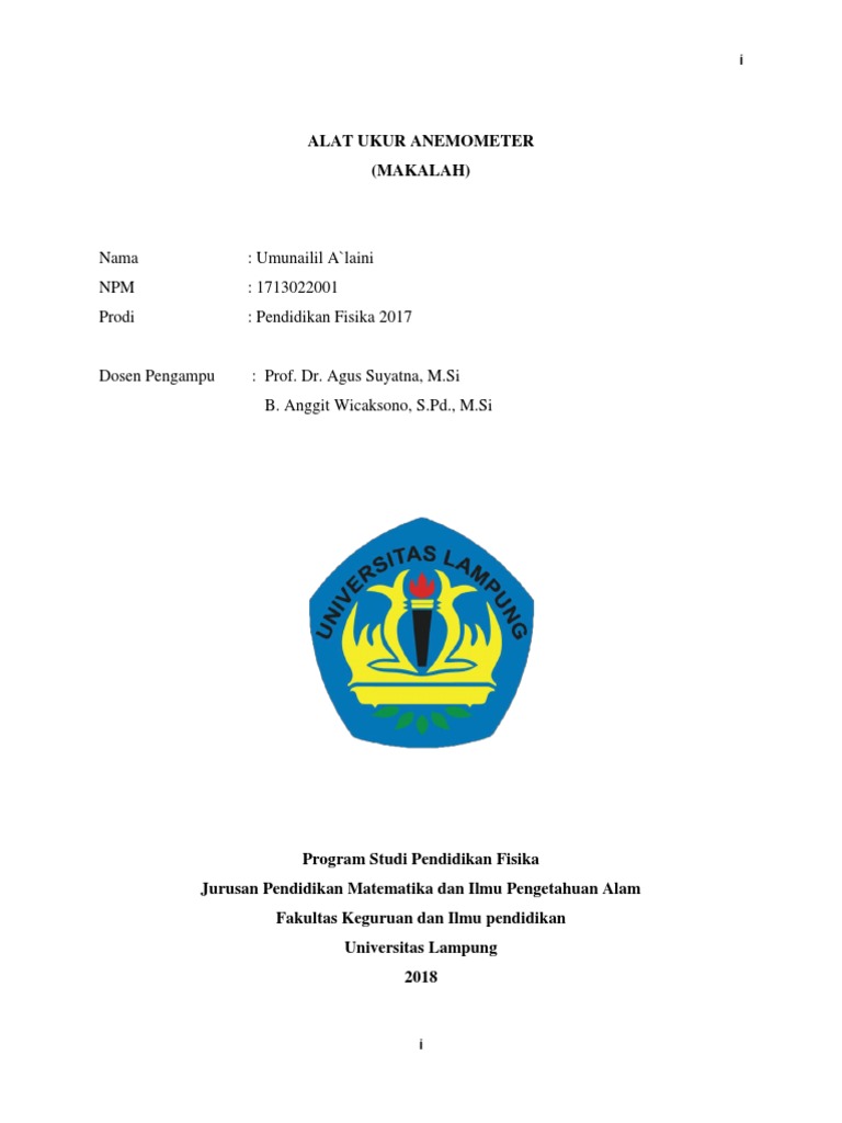 A. Definisi, fungsi dan prinsip kerja alatAnemometer.............................................................2