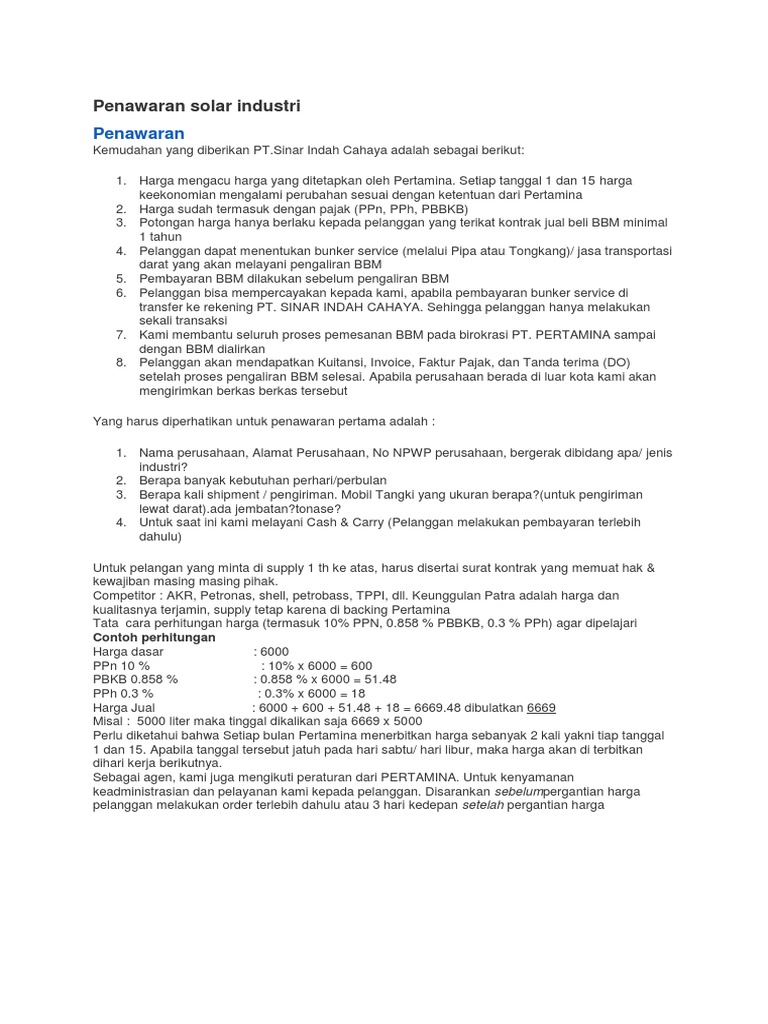 Tata cara perhitungan harga (termasuk 10% PPN, 0.858 % PBBKB, 0.3 % PPh) agar dipelajari