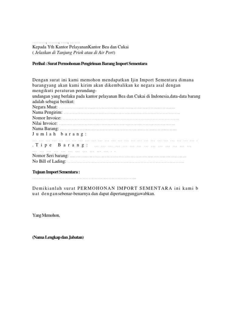 Perihal : Surat Permohonan Pengiriman Barang Import Sementara