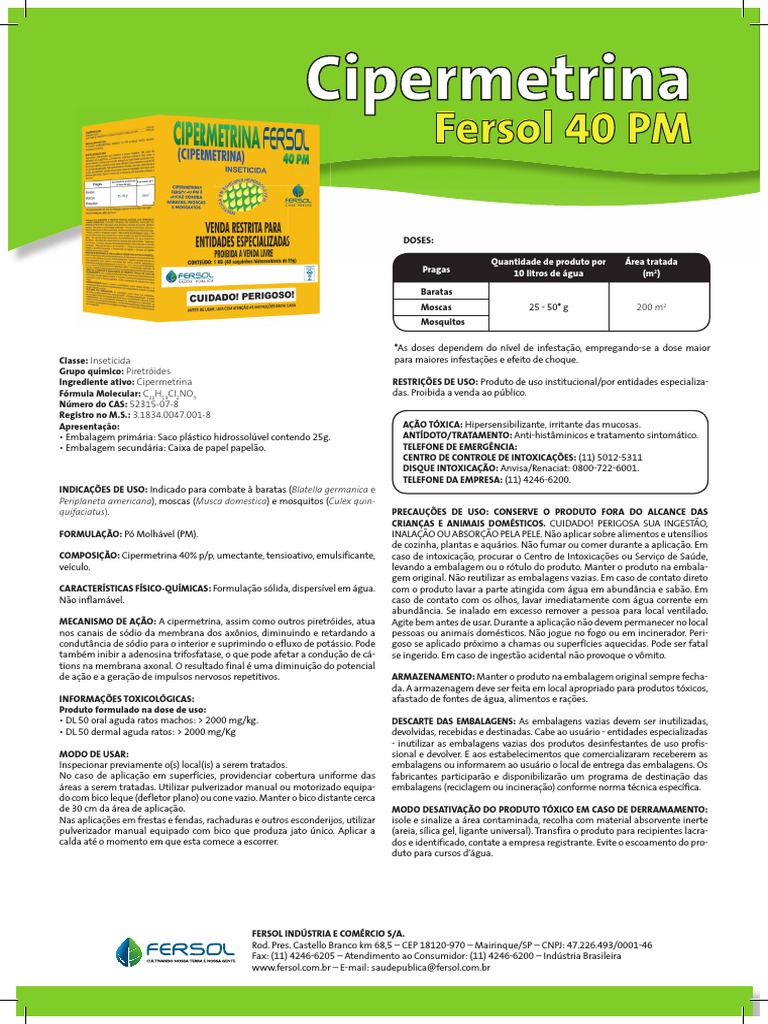 FERSOL INDÚSTRIA E COMÉRCIO S/A. Rod. Pres. Castello Branco km 68,5 – CEP 18120-970 – Mairinque/SP – CNPJ: 47.226.493/0001-46 Fax: (11) 4246-6205 – Atendimento ao Consumidor: (11) 4246-6200 – Indústria Brasileira www.fersol.com.br – E-mail: saudepublica@fersol.com.br
