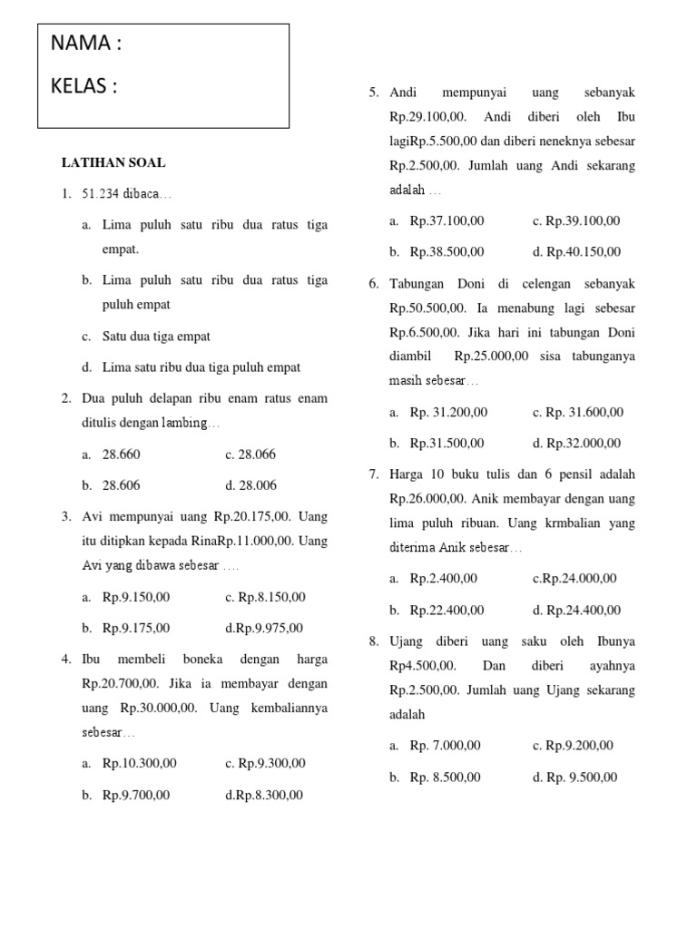 LATIHAN SOAL Rp.2.500,00. Jumlah uang Andi sekarang