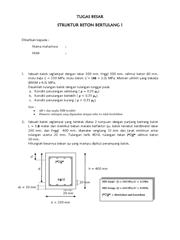 1. Sebuah balok segiempat dengan lebar 300 mm, tinggi 500 mm, selimut beton 60 mm,