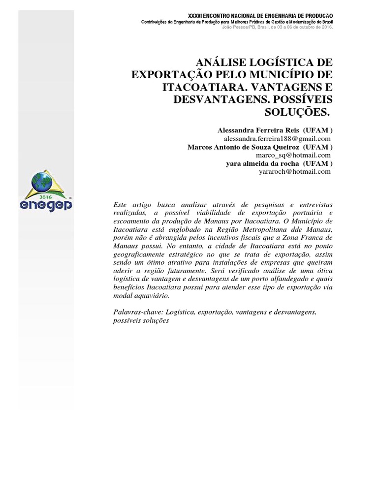 alternativa o município de Itacoatiara, situado no interior do Amazonas, no qual se apresenta geograficamente estratégico para a exportação de produtos produzidos na Zona Franca de Manaus e região metropolitana, visando o mercado Europeu. Nessa abordagem, será apresentado o conceito sobre o assunto, tendo como finalidade propor possíveis soluções para que possa ser explorado o potencial logístico utilizando como opção de exportação do município de Itacoatiara.