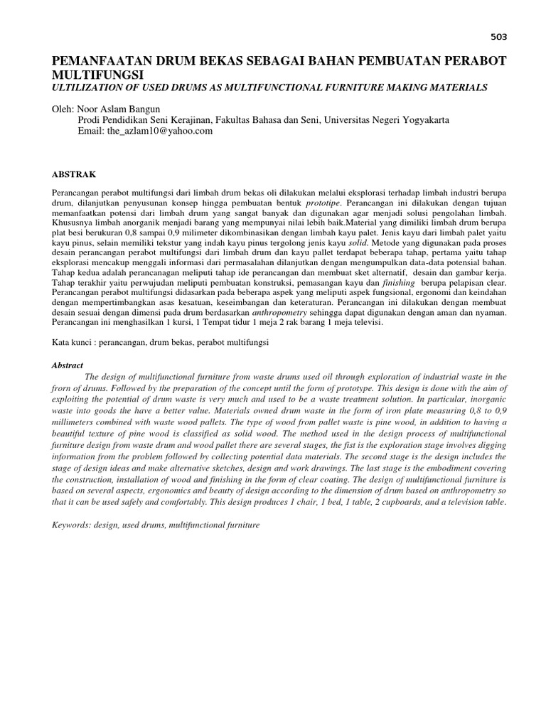 Perancangan perabot multifungsi dari limbah drum bekas oli dilakukan melalui eksplorasi terhadap limbah industri berupa