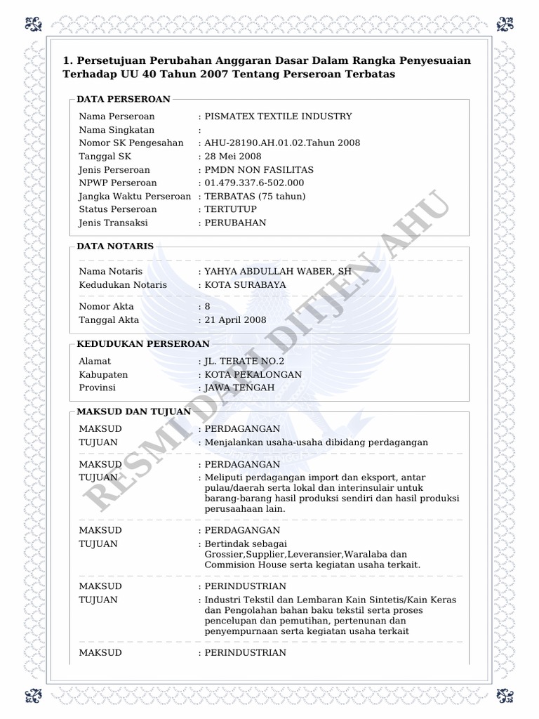 Nama Perseroan : PISMATEX TEXTILE INDUSTRY