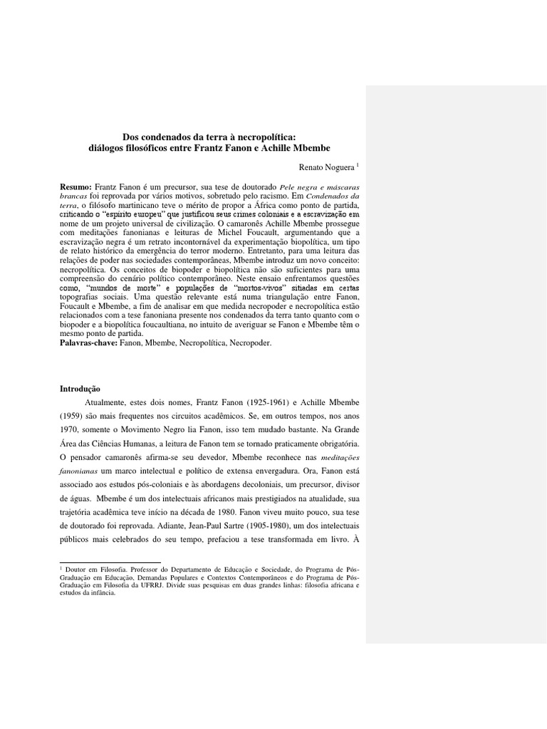 A. Mbembe. A universalidade de Frantz Fanon. Publicado em ArtAfrica (Lisboa):, 2012, p.05.