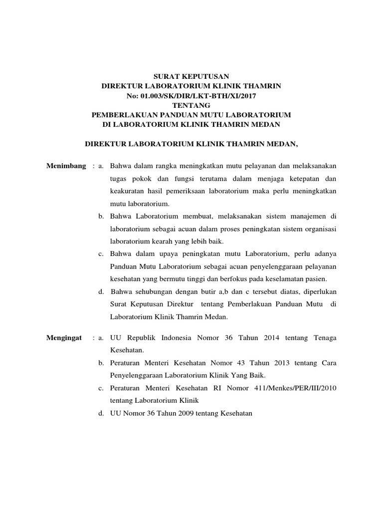 Kesatu : Pemberlakuan Panduan Mutu di Laboratorium Klinik Thamrin Medan.