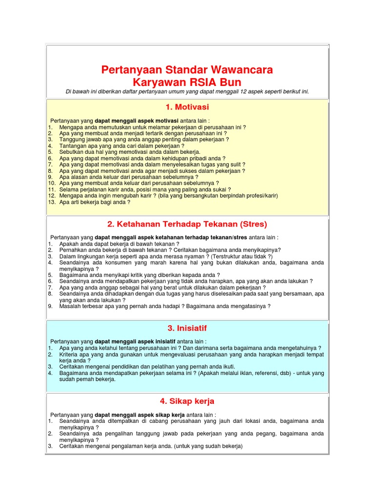 Di bawah ini diberikan daftar pertanyaan umum yang dapat menggali 12 aspek seperti berikut ini.