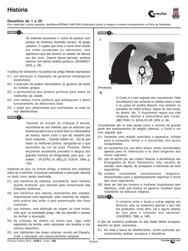 Questão 8 CÁCERES, F. História geral . 4. ed. rev. ampl. atual. São Paulo: Moderna, 1996. Questão 9 SCHMIDT, M. Nova história crítica. São Paulo: Nova Geração, 2005. Questão 10 LINHARES, M. Y. et al. História geral do Brasil. Rio de Janeiro: Campus, 1996. Questão 12 KOSHIBA, L.; PEREIRA, D. História do Brasil. 5. ed. rev. e ampl. São Paulo: Atual, 1987. Questão 14 BRAICK, P.; MOTA, M. História das cavernas ao terceiro milênio: do avanço imperialista no século XIX aos dias atuais. 2. ed. São Paulo: Moderna, v. 3, 2010. Questão 16 OYAMA, T, O grande teste da China. Veja . São Paulo: Abril, ed. 2292, ano 45, n. 43, 24 out. 2012. Questão 17 TEIXEIRA, D. Um caos sem fronteira. Veja. São Paulo: Abril, ed. 2290, ano 45, n. 41, 10 out. 2012. Questão 19 TAVARES, L. H. História da Bahia. 10. ed. rev. e ampl. São Paulo: UNESP: Salvador: EDUFBA, 2001. Questão 30 SACCHETTA, P. A migração sob o impacto da crise. Atualidades Vestibular+ENEM . São Paulo: Abril, ed. 15, 1. sem. 2012. Questão 31 A HISTÓRIA se repete. Ciência Hoje. Rio de Janeiro: SBPC, vol. 60, set. 2012. Questão 32 COIVARA cultivo itinerante na floresta tropical. Ciência Hoje. Rio de Janeiro: SBPC, n. 297, vol. 50, out. 2012. Questão 33 REALI, H. et al. O que fazer com a madeira amazônica. Planeta. São Paulo: Três, ed. 481, ano 40, out. 2012. Questão 34 FRAGA, I. Metrópole sustentável: é possível? Ciência Hoje. Rio de Janeiro: SBPC, n. 274, vol. 46, set. 2010. Questão 39 SABINO, M. Excepcionalidade. Veja. São Paulo: Abril, ed. 2292, ano 45, n. 43, 24 out. 2012. Questão 40 MERCOSUL vitaminado. Planeta. São Paulo: Três, ed. 480, ano 40, set. 2012.