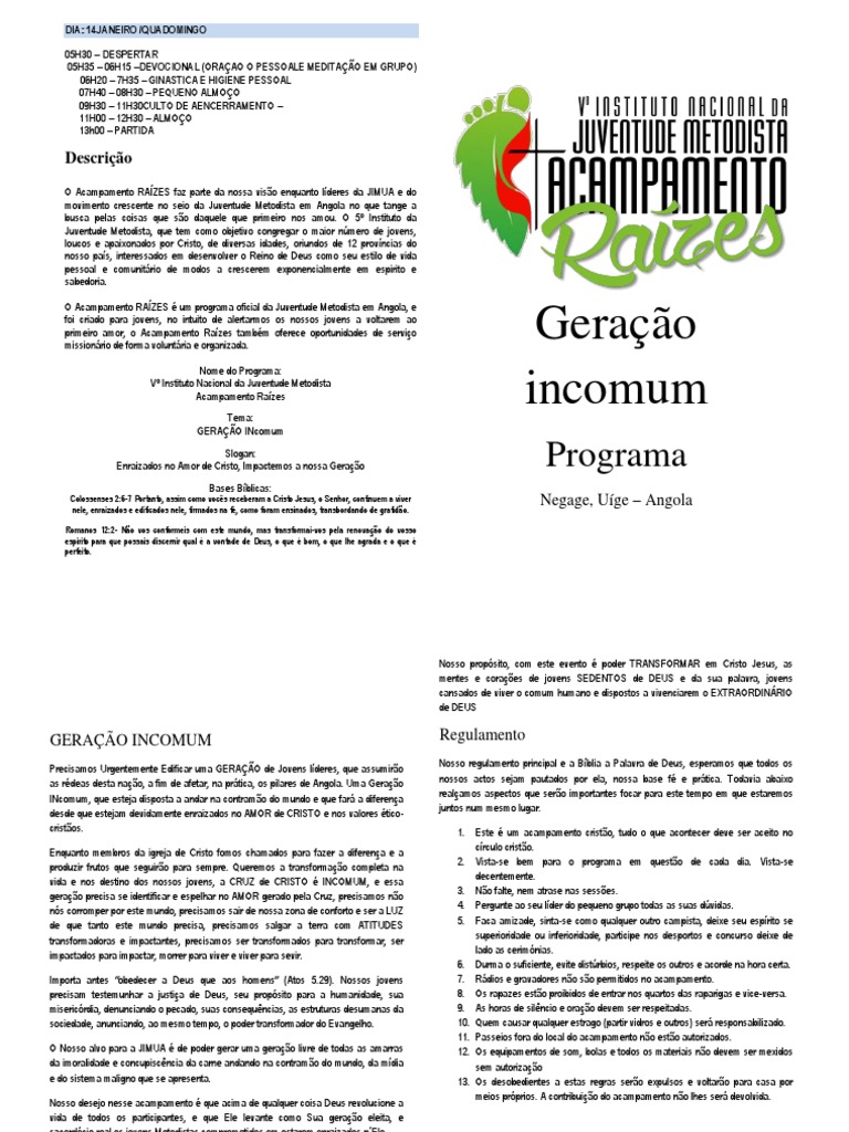 O Nosso alvo para a JIMUA é de poder gerar uma geração livre de todas as amarras 12. Os equipamentos de som, bolas e todos os materiais não devem ser mexidos