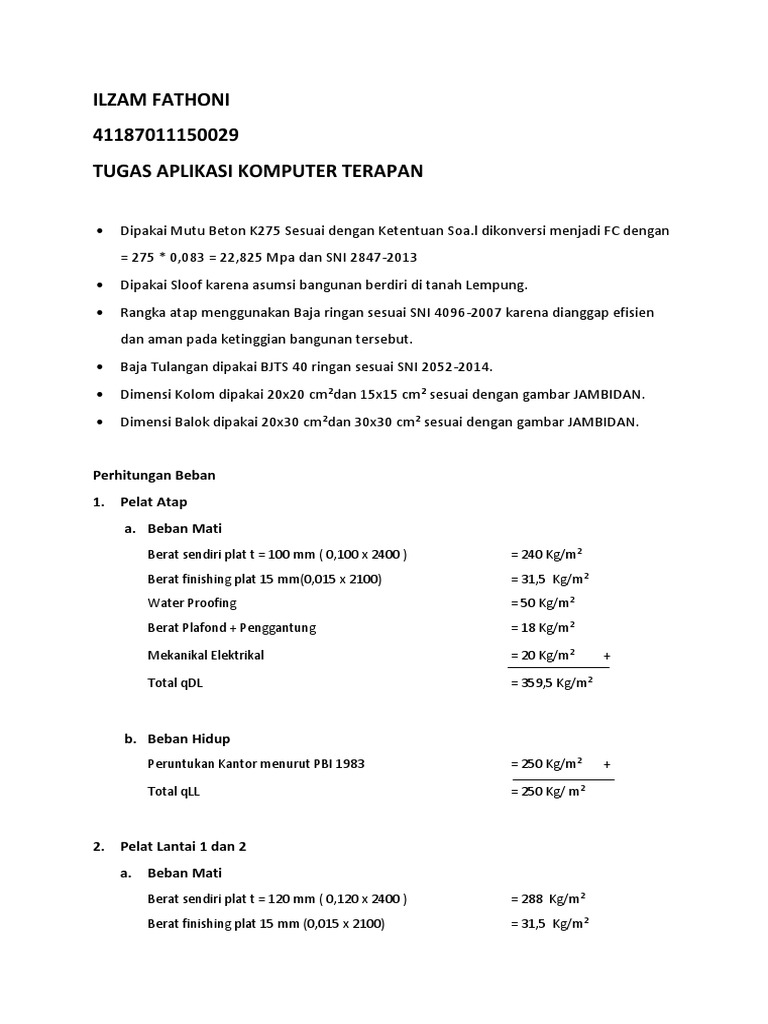 Berat sendiri plat t = 120 mm ( 0,120 x 2400 ) = 288 Kg/m2