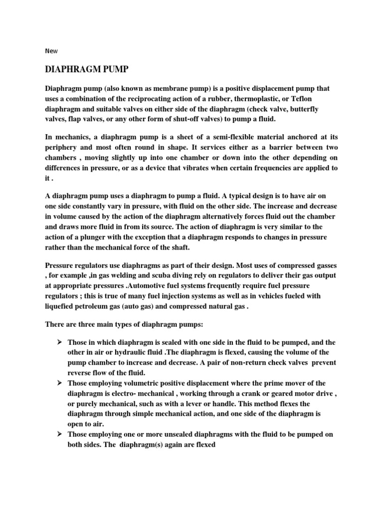 Diaphragm pump (also known as membrane pump) is a positive displacement pump that