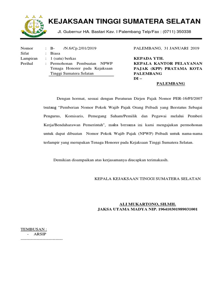 Nomor : B- /N.6/Cp.2/01/2019 PALEMBANG, 31 JANUARI 2019