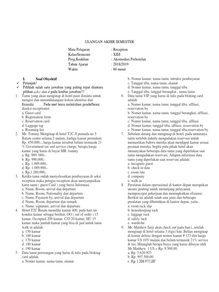 I. Soal Obyektif b. Nomer kamar, nama tamu, intruksi pembayaran