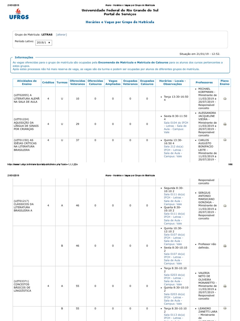 Aluno - Horários e Vagas por Grupo de Matrícula