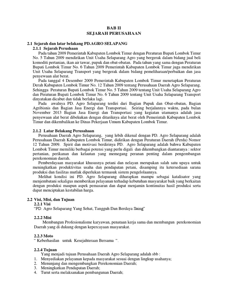 12 Tahun 2009. Spirit dan motivasi berdirinya PD. Agro Selaparang adalah bahwa Kabupaten