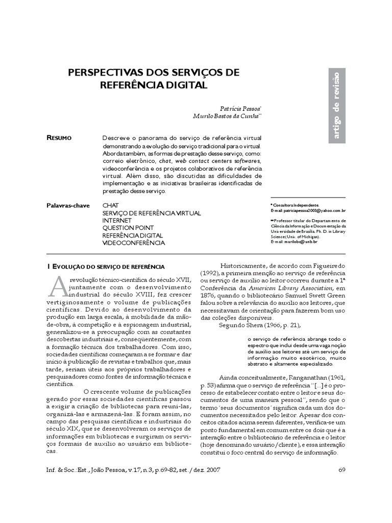 mação brasileiros, tanto para os bibliotecários como para os usuários e para as instituições como um todo. Devido à grande extensão territorial brasilei- ra, esses serviços seriam de grande importância para atender aos usuários sem que estejam fisica- mente na biblioteca, diminuindo gastos com cha- madas telefônicas locais e interurbanas e com o ser- viço de correio. Autores como Janes (2004) e Coffman (2003) acreditam que os serviços de referência virtual vão continuar crescendo e adquirindo cada vez mais adeptos. Coffman espera ainda que as tecnologias de voz venham a substituir as de chat como método principal de comunicação de servi- ços de referência virtual. Engi e Hibner (2005) afirmam que, dentro das bibliotecas, a tendência é a utilização de ferramentas de referência online disponíveis em qualquer lugar como, por exem- plo, computadores portáteis e pranchetas eletrô- nicas com comunicação em rede sem fio. Assim, os serviços de referência oferecerão melhor aten- dimento aos usuários, com economia de tempo e mais atenção individual.