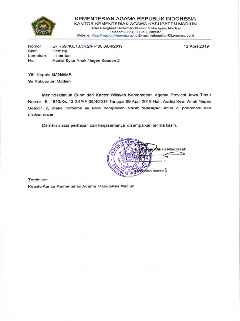 Nomor : B- 1850/Kw.13.2.4lPP.OOl4l2O19 Tanggal 09 April 2019 Hal : Audisi Syiar Anak Negeri