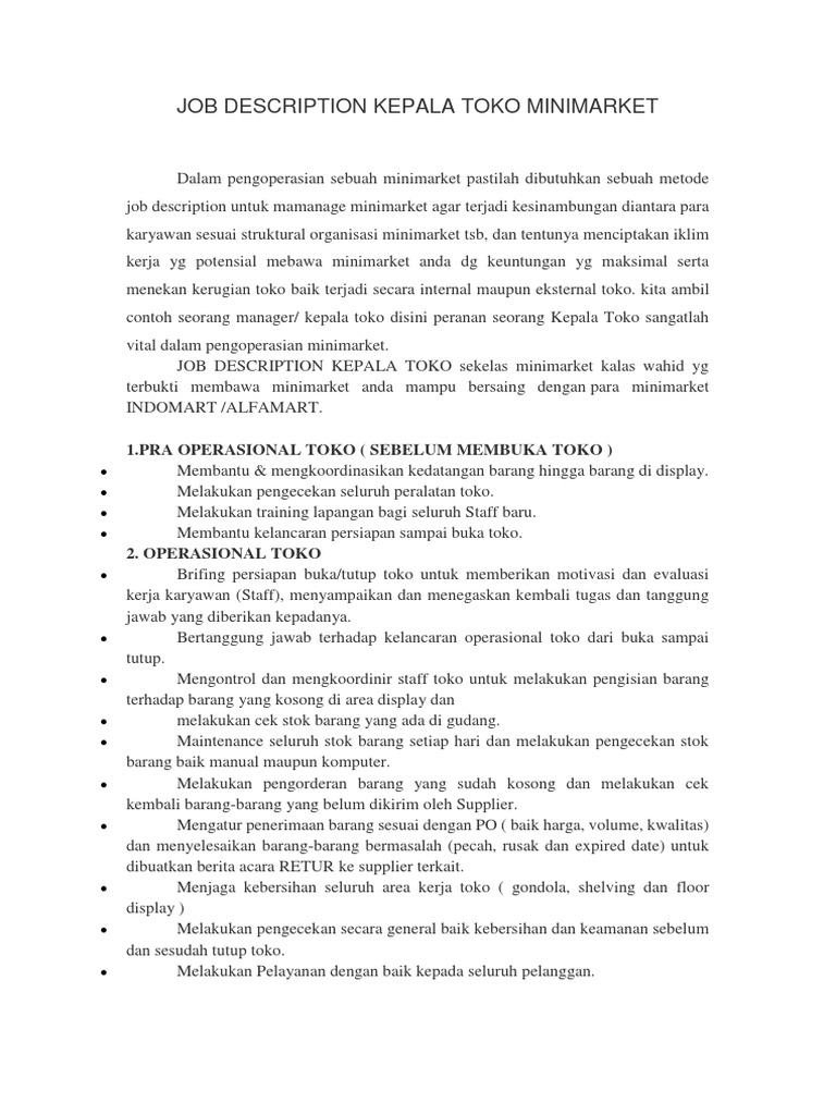 JOB DESCRIPTION KEPALA TOKO MINIMARKET