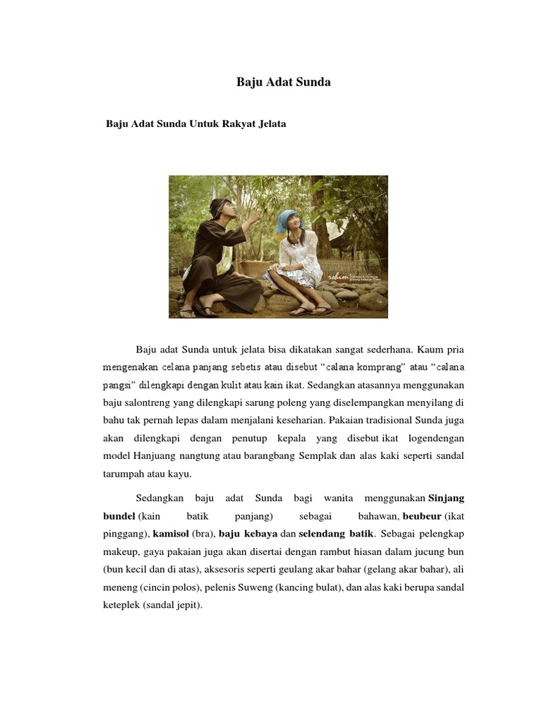 Baju adat Sunda untuk jelata bisa dikatakan sangat sederhana. Kaum pria