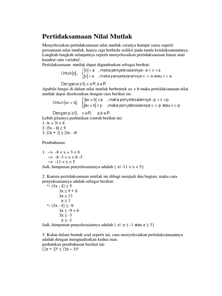 pertidaksamaan nilai mutlak. Pertidaksamaan nilai mutlak adalah pertidaksamaan