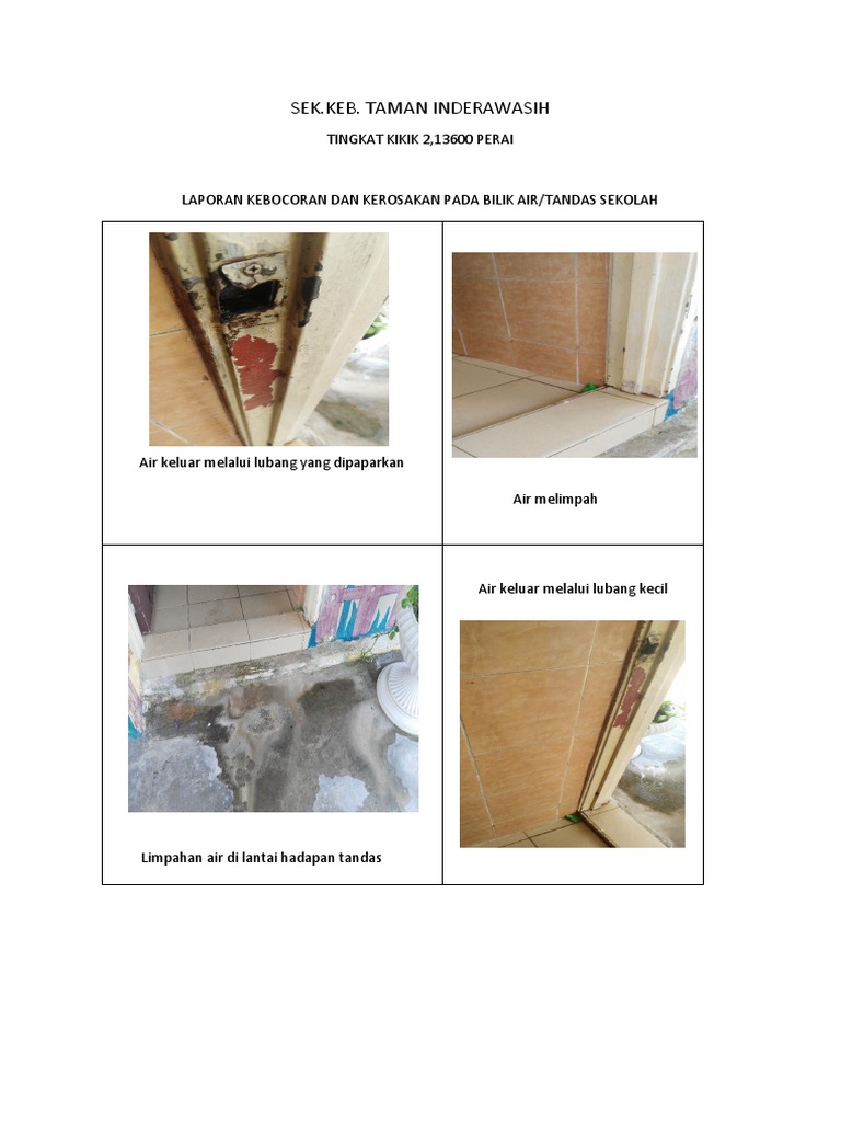 Laporan mengenai kebocoran air dan kerusakan bilik air/tandas di Sekolah Taman Inderawasih. Air keluar dari lubang kecil di dinding dan melimpah di lantai depan bilik tandas, menyebabkan banjir kecil di area tersebut. Perbaikan diperlukan untuk menghentikan kebocoran dan mencegah kerusakan lebih lanjut.