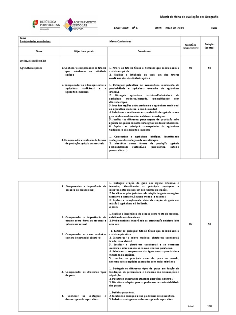 Agricultura e pesca 1. Conhecer e compreender os fatores 1. Referir os fatores físicos e humanos que condicionam a 05 50