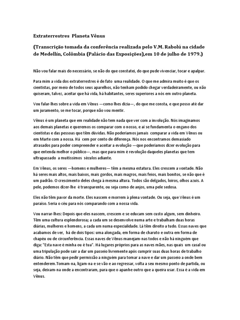 Vênus é um planeta que em realidade não tem nada que ver com a involução. Nós imaginamos aos demais planetas e queremos os comparar com o nosso, e aí se fundamenta o engano dos cientistas e das pessoas que têm dúvidas. Não poderíamos jamais comparar a vida em Vênus ou em Marte com a nossa. Há cem por cento de diferença. Nós nos encontramos demasiado atrasados para poder compreender e aceitar a evolução —que poderíamos dizer evolução para que entenda melhor o público—, mas que para mim é revolução daqueles planetas que tem ultrapassado a muitíssimos séculos adiante.