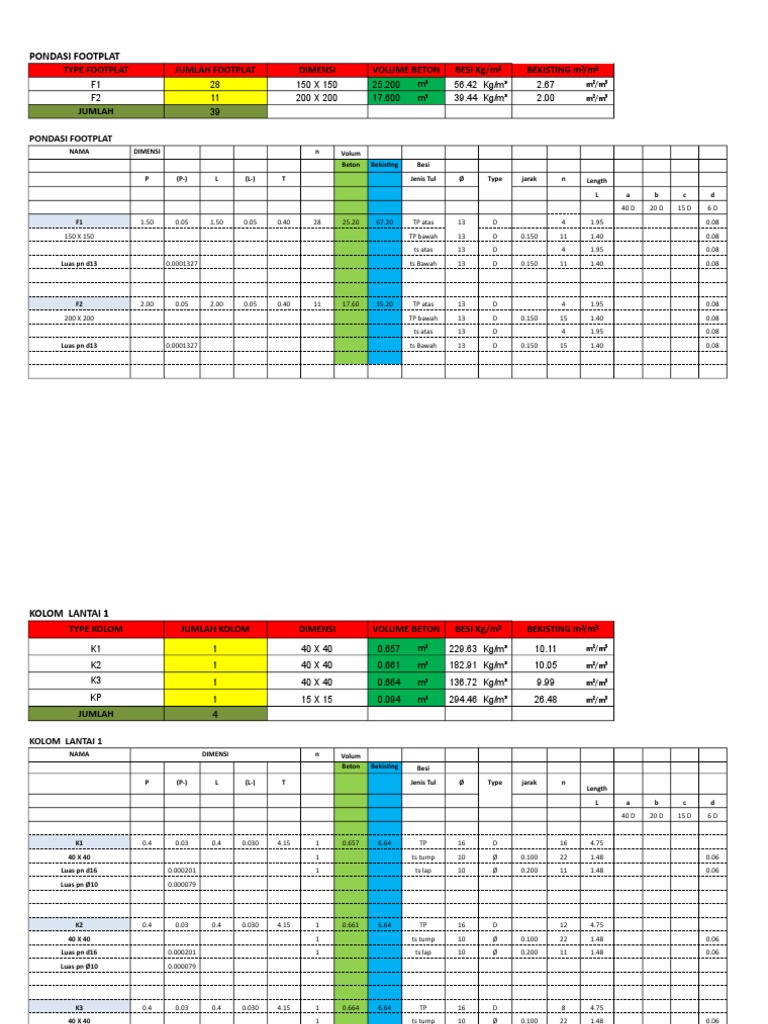 TYPE FOOTPLAT JUMLAH FOOTPLAT DIMENSI VOLUME BETON BESI Kg/m³ BEKISTING m²/m³