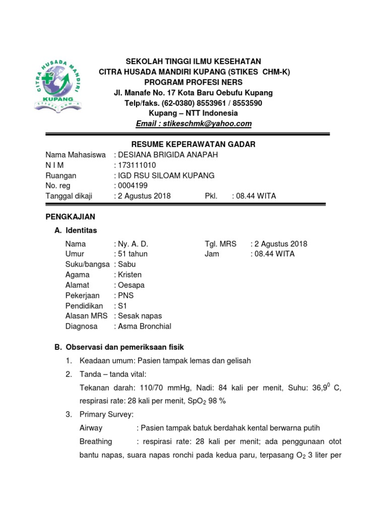 ada penggunaan otot bantu napas, suara napas wheezing pada seluruh lapang paru, terpasang O 2 3 kimiawi (histamine,