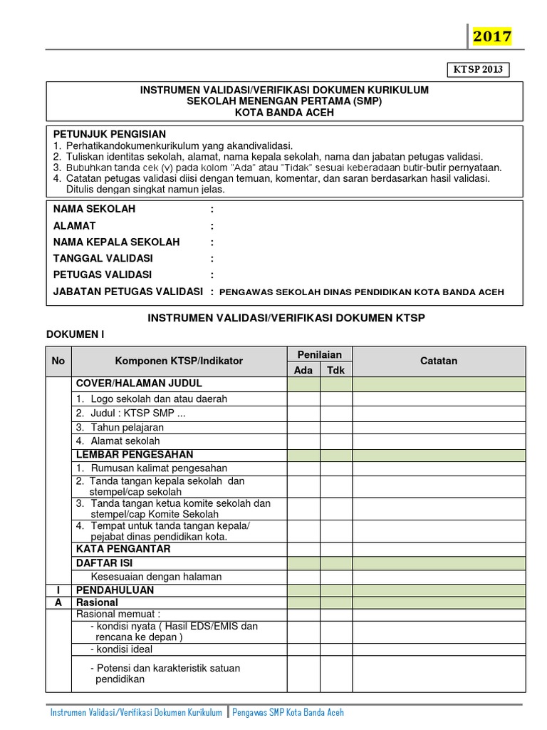 Instrumen Validasi/Verifikasi Dokumen Kurikulum Pengawas SMP Kota Banda Aceh