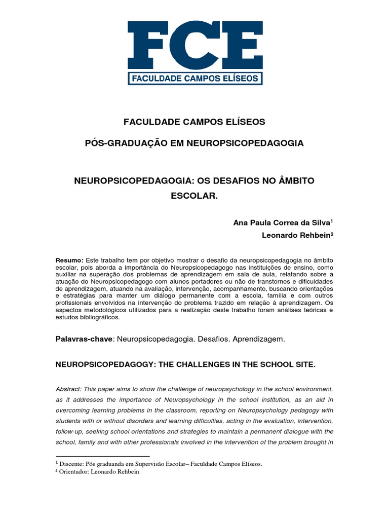 Palavras-chave: Neuropsicopedagogia. Desafios. Aprendizagem.