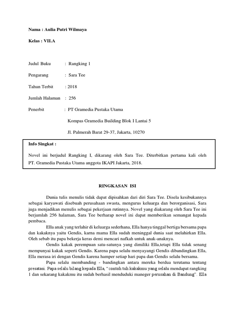 Novel ini berjudul Rangking I, dikarang oleh Sara Tee. Diterbitkan pertama kali oleh