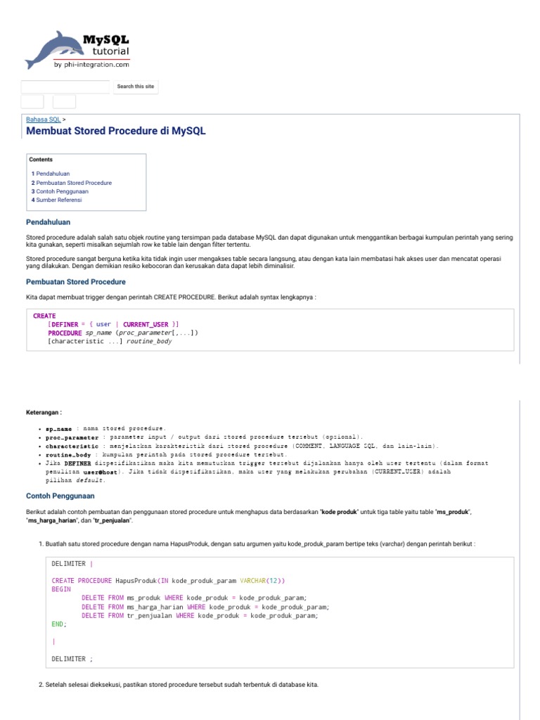 Stored procedure adalah salah satu objek routine yang tersimpan pada database MySQL dan dapat digunakan untuk menggantikan berbagai kumpulan perintah yang sering