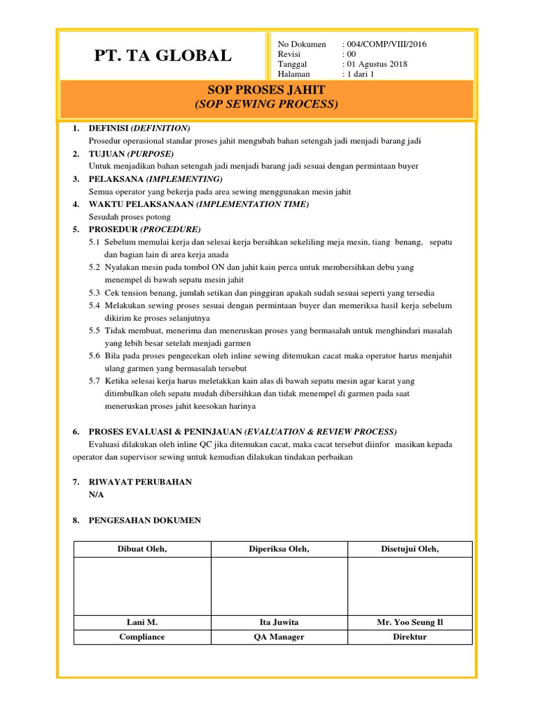 Prosedur operasional standar proses jahit mengubah bahan setengah jadi menjadi barang jadi