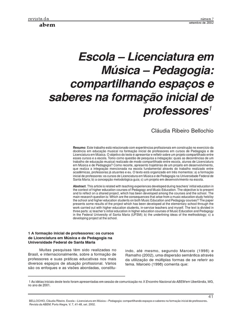 BELLOCHIO, Cláudia Ribeiro. Escola – Licenciatura em Música – Pedagogia: compartilhando espaços e saberes na formação inicial de professores.