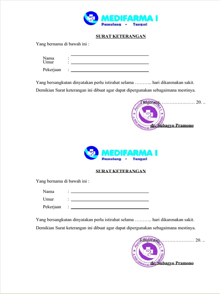 Yang bersangkutan dinyatakan perlu istirahat selama ……….. hari dikarenakan sakit.