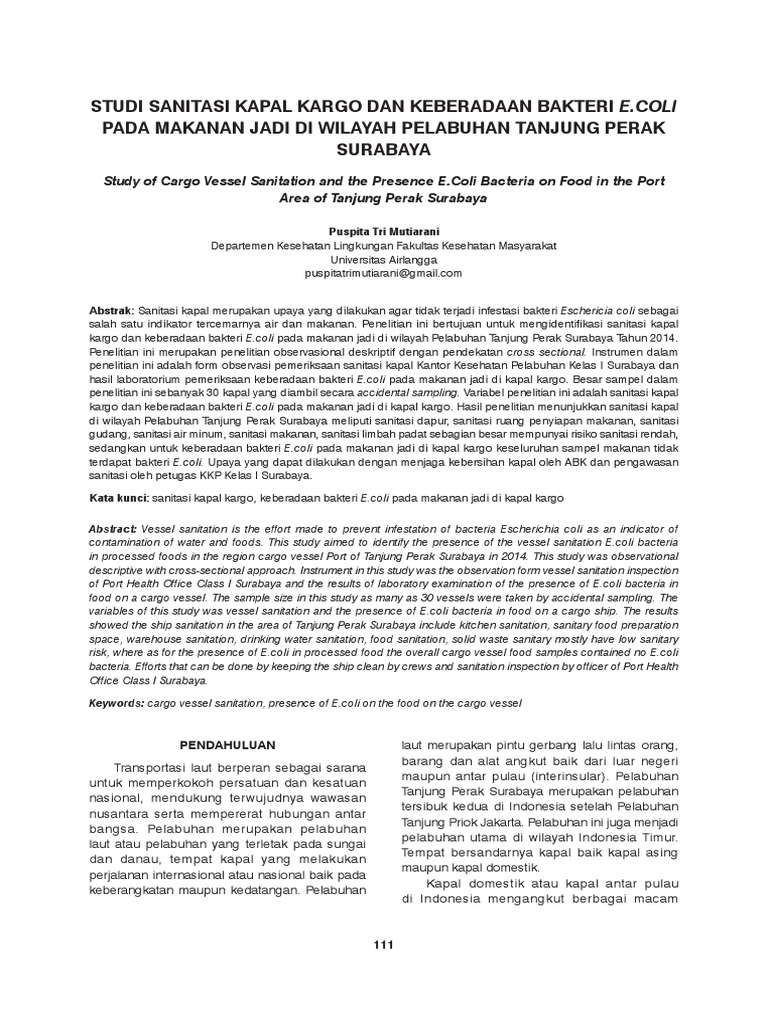 Kata kunci: sanitasi kapal kargo, keberadaan bakteri E.coli pada makanan jadi di kapal kargo