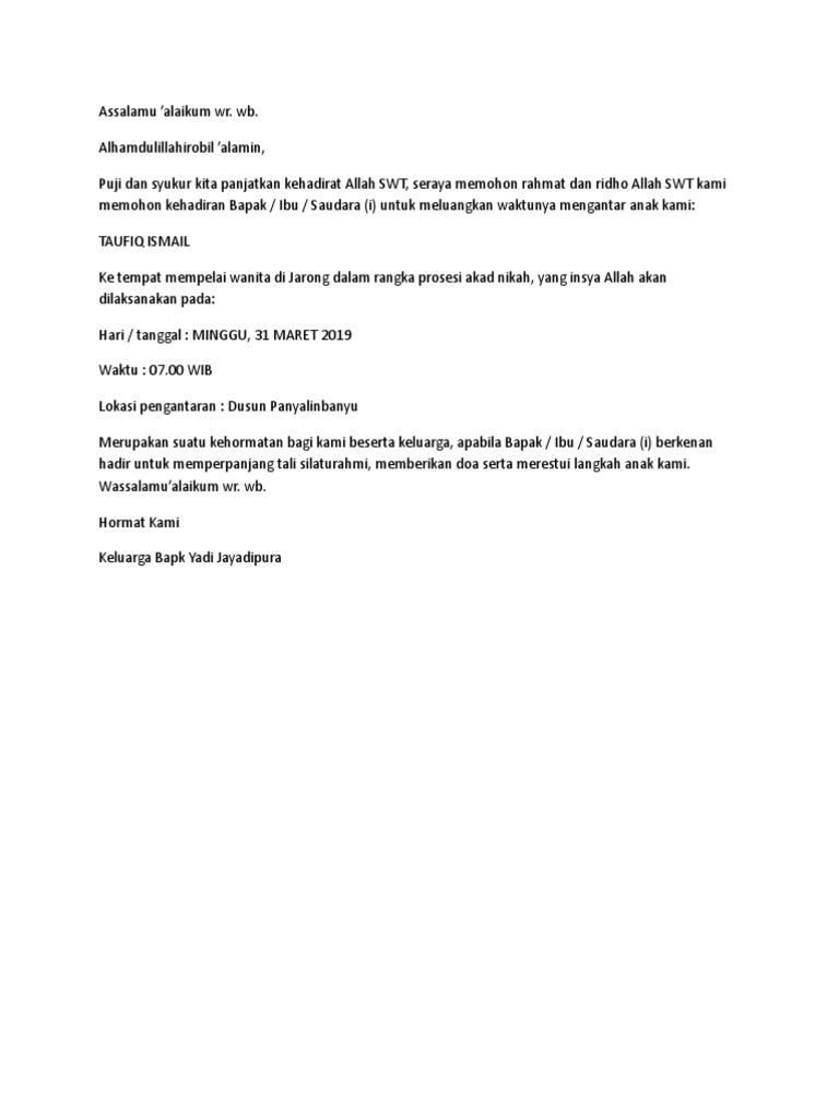memohon kehadiran Bapak / Ibu / Saudara (i) untuk meluangkan waktunya mengantar anak kami: