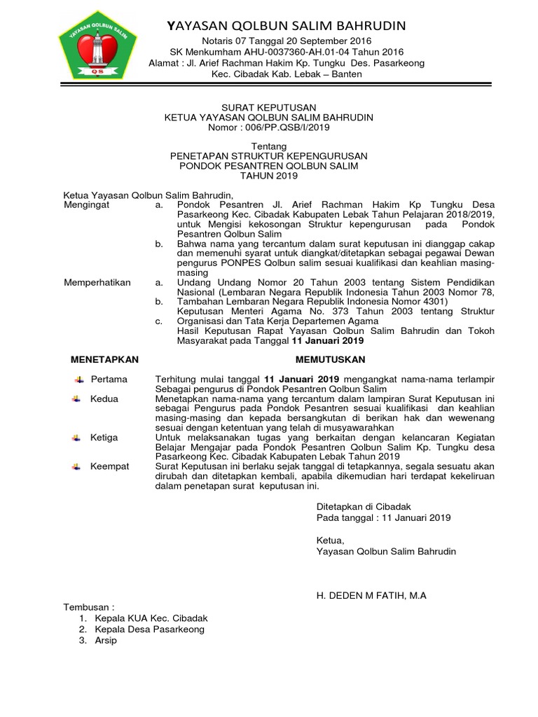PENANGGUNGJAWAB : Ketua Yayasan Qolbun Salim Bahrudin