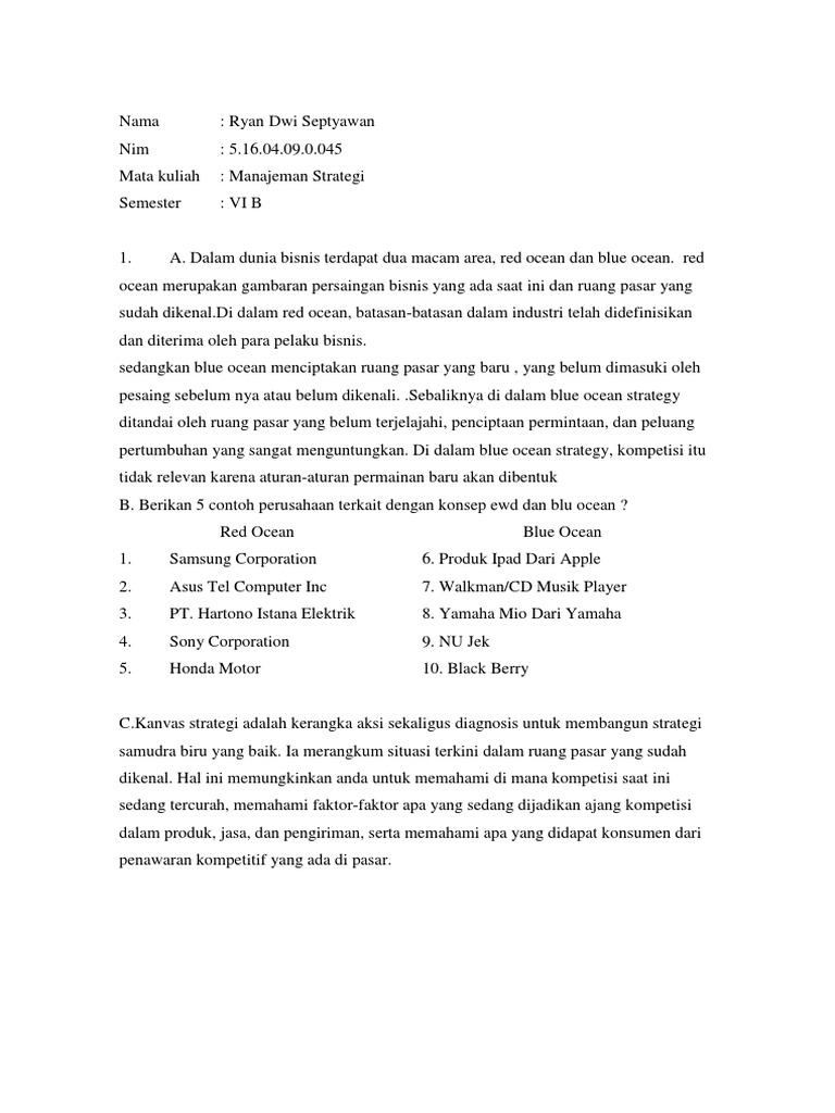 1. A. Dalam dunia bisnis terdapat dua macam area, red ocean dan blue ocean. red