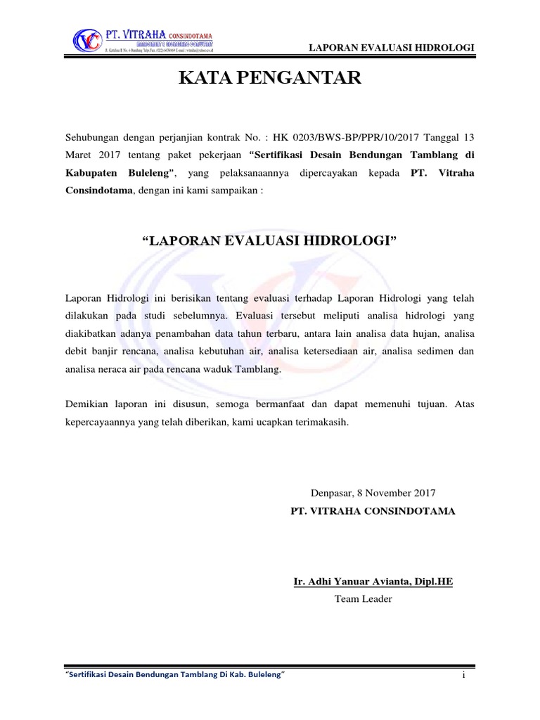 Laporan Hidrologi ini berisikan tentang evaluasi terhadap Laporan Hidrologi yang telah