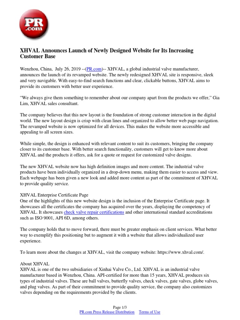 Wenzhou, China, July 26, 2019 --(PR.com)-- XHVAL, a global industrial valve manufacturer,