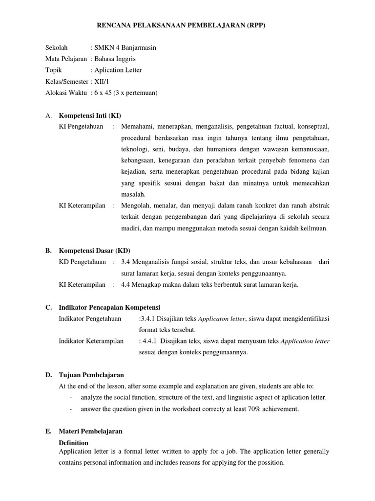 Indikator Pengetahuan :3.4.1 Disajikan teks Applicaton letter, siswa dapat mengidentifikasi