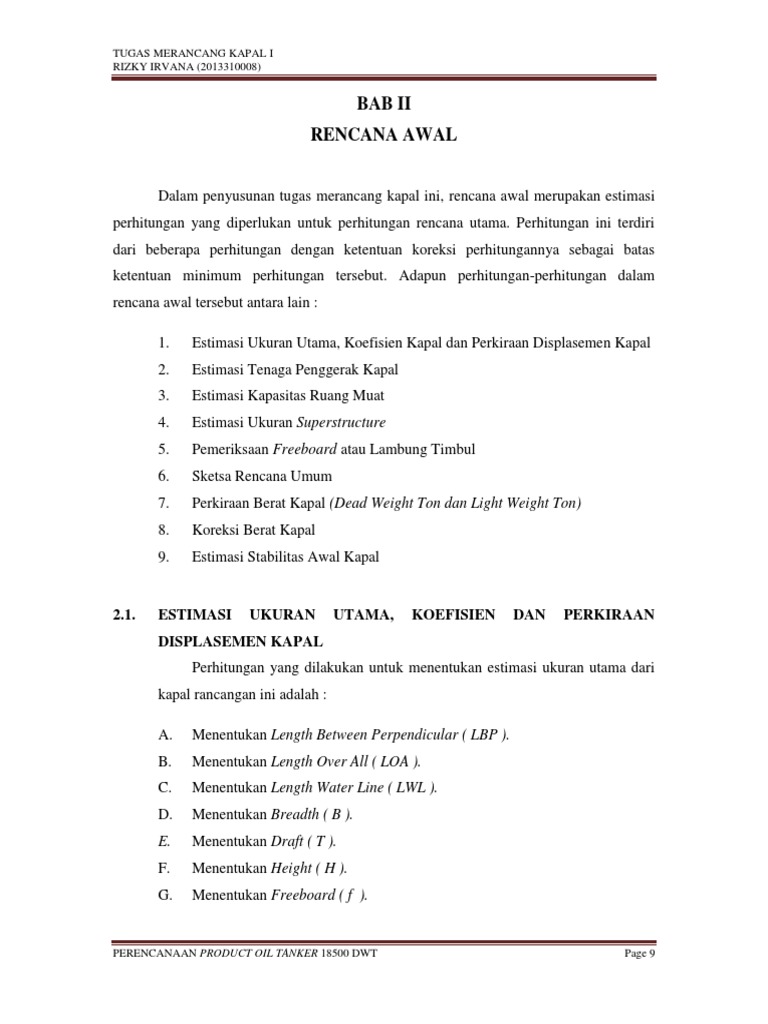 Dalam penyusunan tugas merancang kapal ini, rencana awal merupakan estimasi