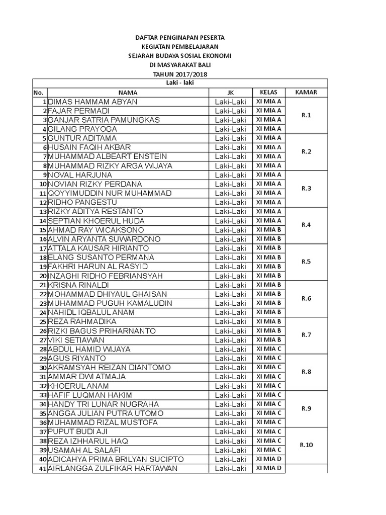 No. NAMA JK KELAS KAMAR