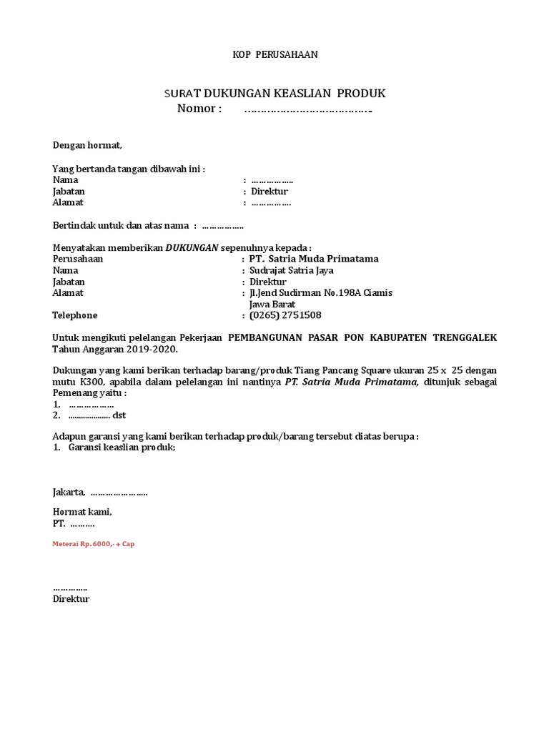 SURAT DUKUNGAN KEASLIAN PRODUK
