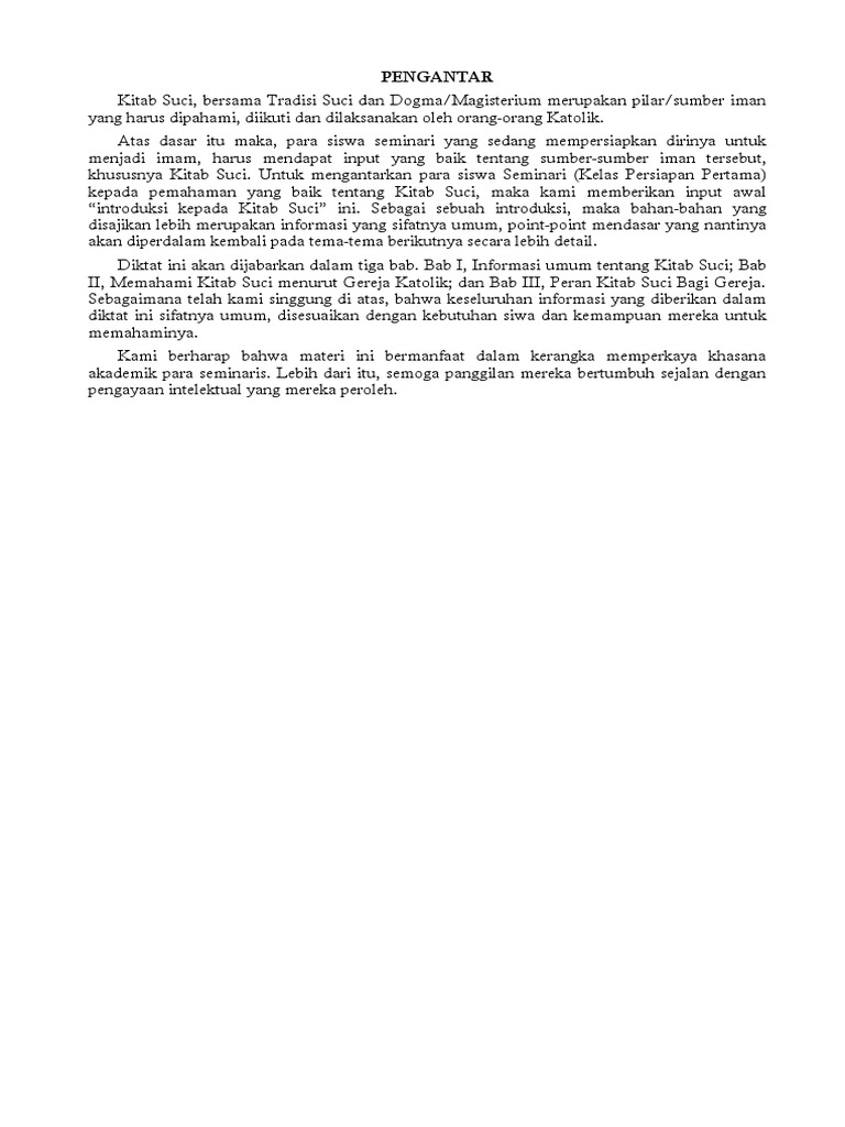Diktat ini akan dijabarkan dalam tiga bab. Bab I, Informasi umum tentang Kitab Suci; Bab