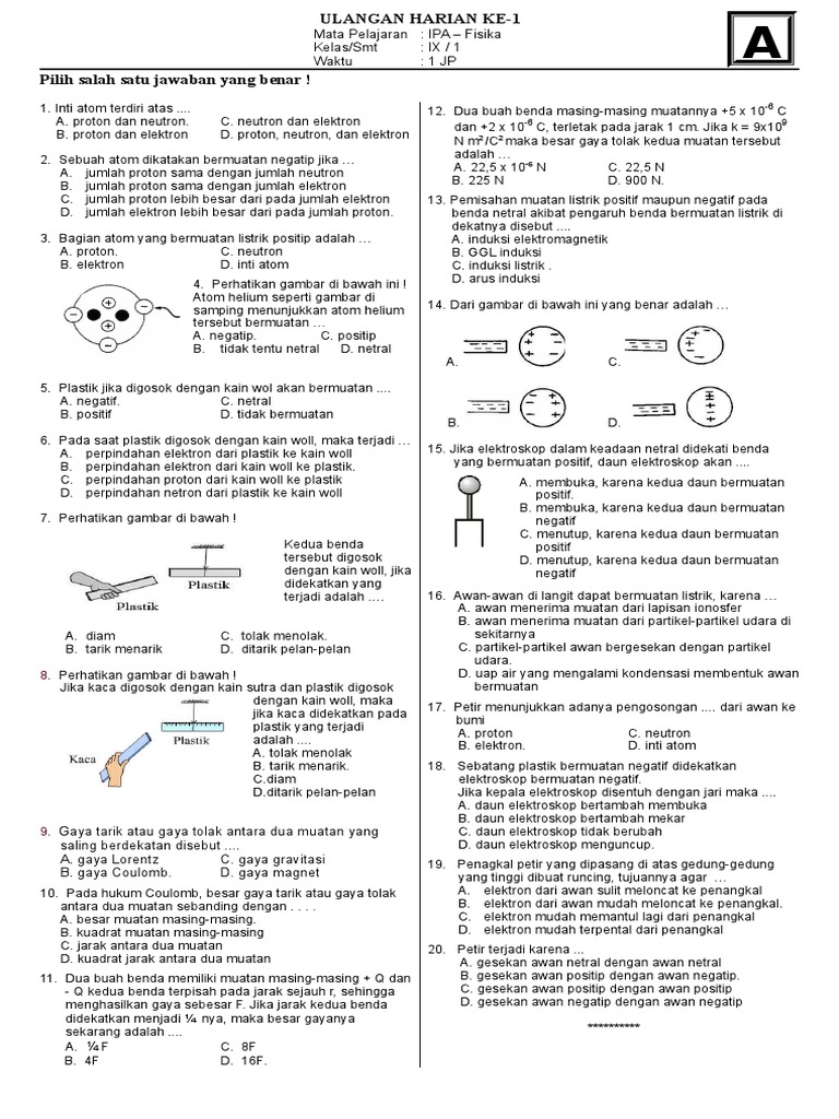 1. Inti atom terdiri atas .... 12. Dua buah benda masing-masing muatannya +5 x 10-6 C